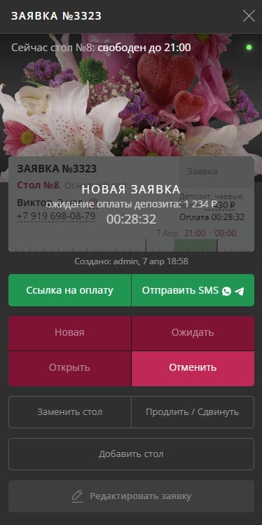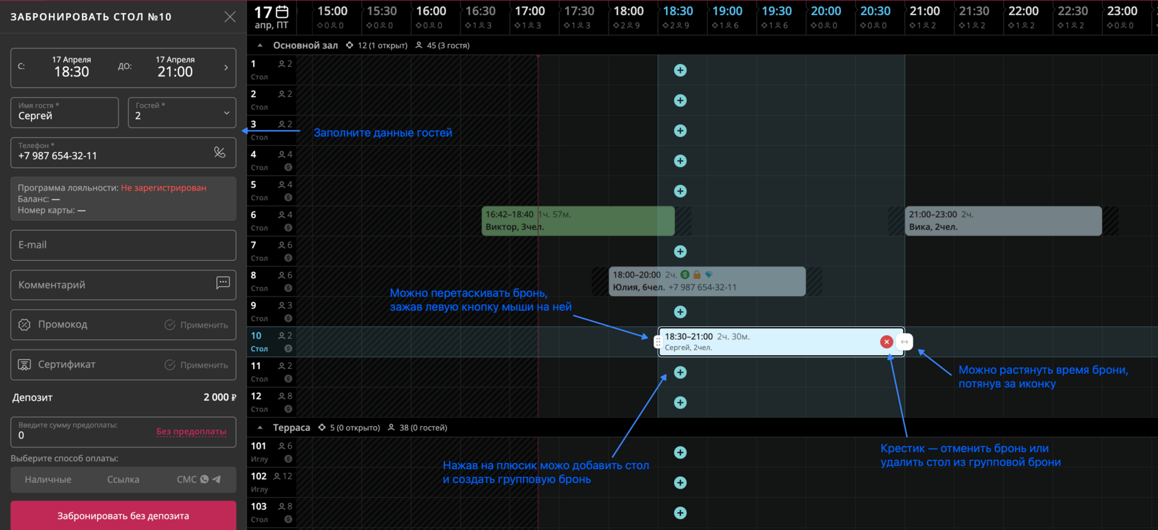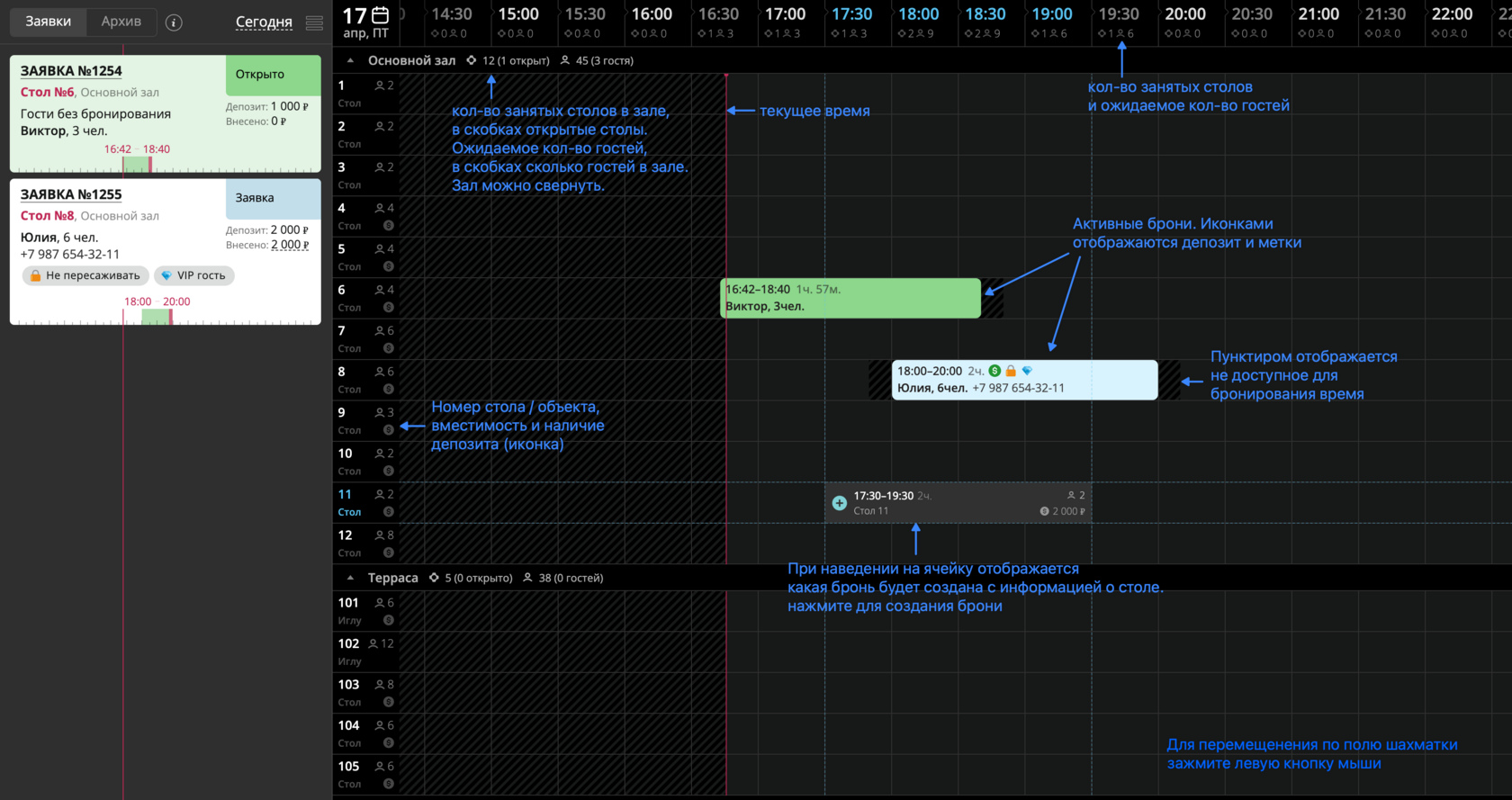 Визуальные обозначения бронейБрони на шахматке отображаются прямоугольниками, на них видно время брони, продолжительность, наличие оплаченного депозита (зеленая иконка доллара), метки (иконки), если есть комментарий отображается иконка сообщения, на второй строке информация о госте и кол-во гостей. Цвета броней соответствуют стандартным статусам в рестоплейс: светло голубая (обычная бронь), желтая (ожидаем — время наступило но гости не пришли), зеленая (открыта — гости сидят), светло красная (закрытие — время выходит), ярко красная с иконкой (время вышло но бронь не закрыли). Новые брони ярко зеленые с надписью «Новая заявка», так же есть брони с ожиданием оплаты от гостя с надписью «Ожидание оплаты» и отсчетом времени. Групповые брони соседних столов объединяются в общий прямоугольник, если групповая бронь не на соседних столах — они соединяются полоской