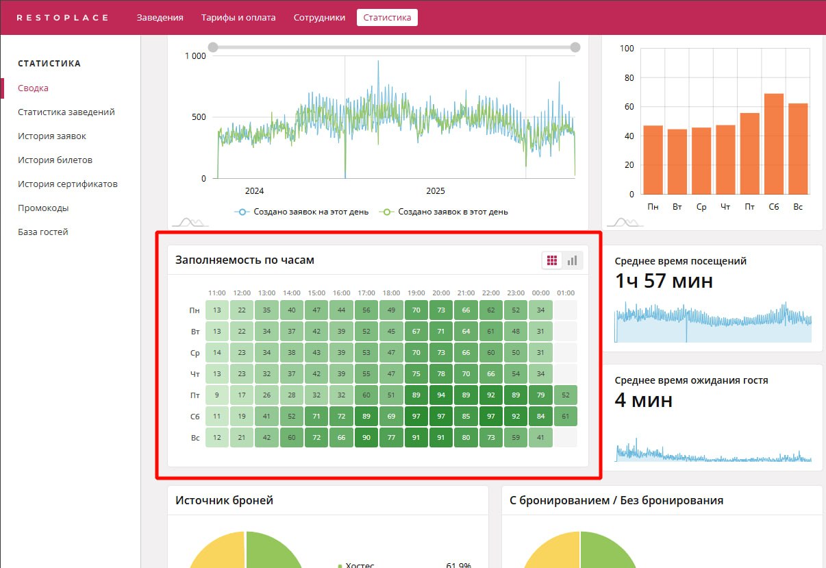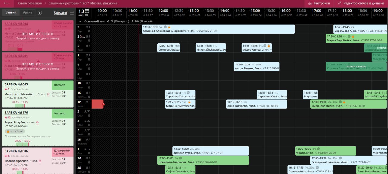 - Столбцы (Сверху): Временная шкала (14:30, 15:00 и т.д.), кол-во занятых столов и кол-во ожидаемых гостей