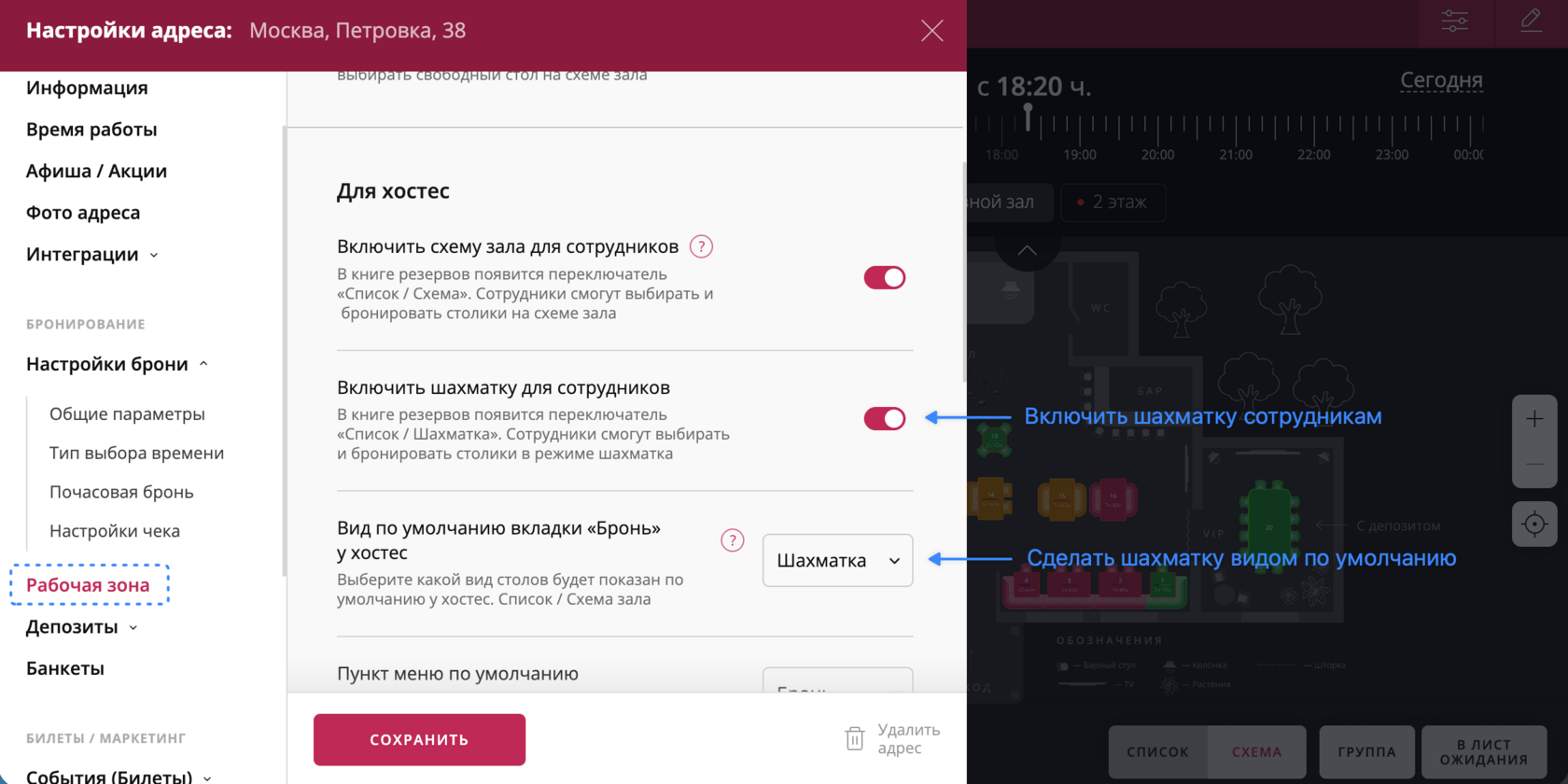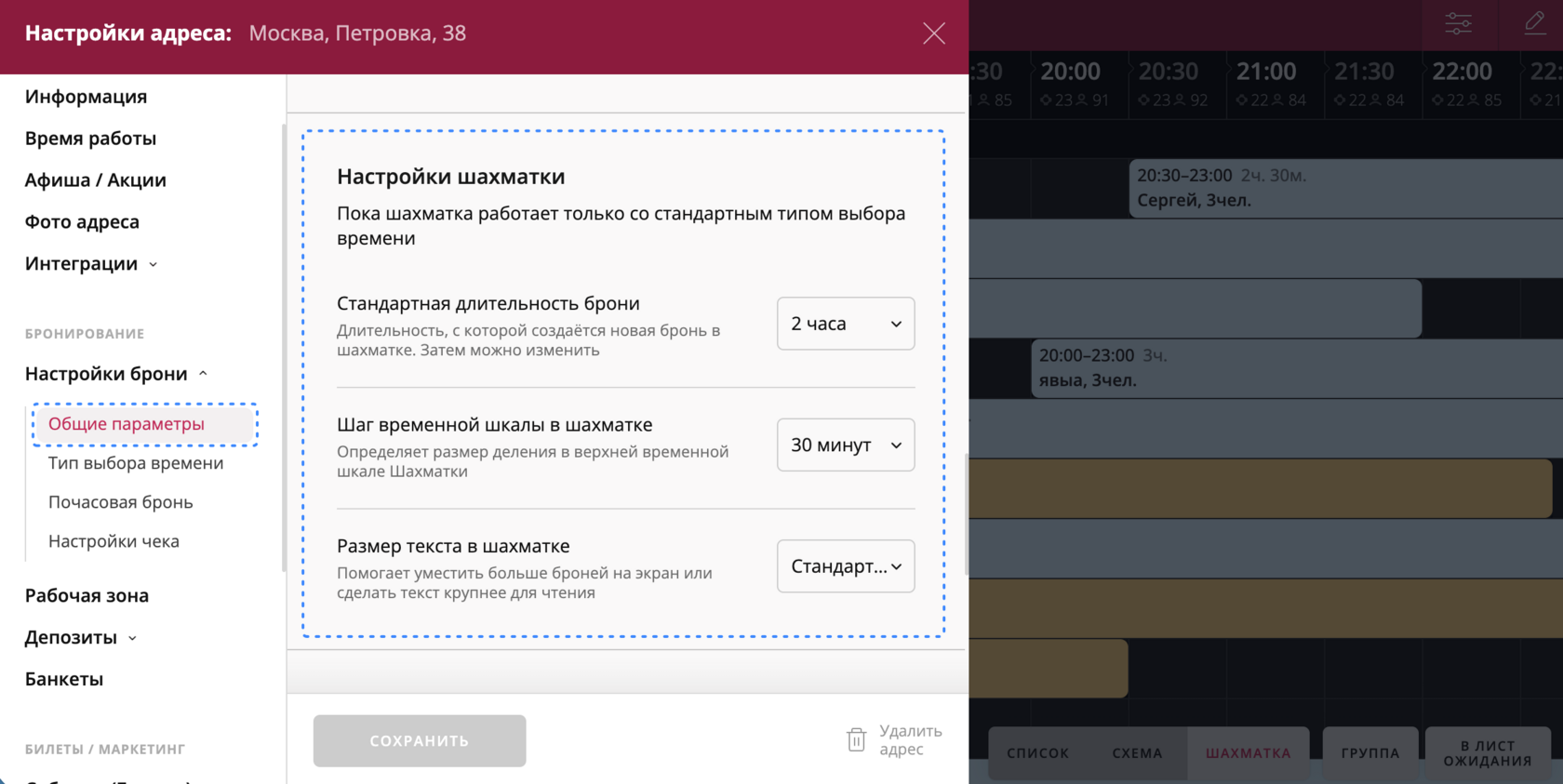 Настройки брони → Общие параметры, блок «Настройки шахматки»: